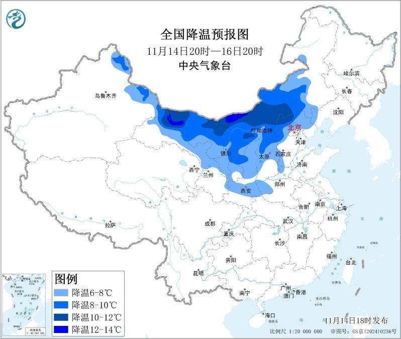 r其中,11月14日20时至16日20时,新疆东北部、内蒙古中西部、甘肃中西部、宁夏、陕西中北部、山西中北部、河北北部、北京北部等地气温下降6~10℃,内蒙古中西部部分地区降温10℃~14℃。